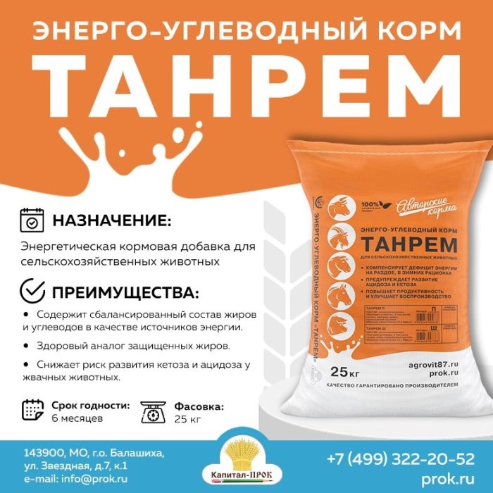Энергетическая кормовая добавка Танрем - естественный источник энергии для компенсации дефицита энергии и профилактики нарушений обмена веществ в рационе КРС.