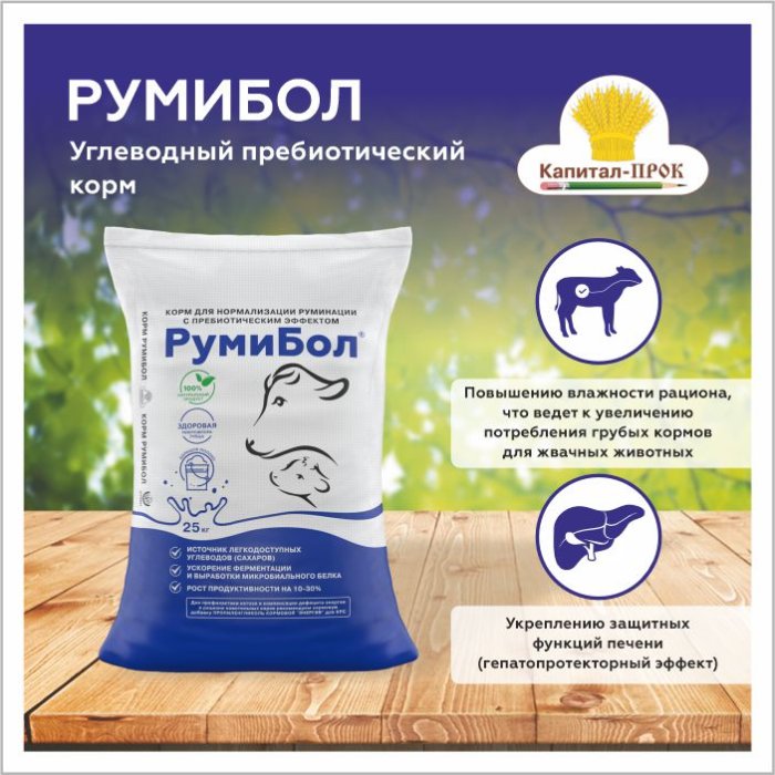 Вторым наиболее эффективным и полезным методом повышения качественных характеристик говядины и сокращения сроков откорма является применение пребиотических кормовых добавок. Одной из таких является корм «Румибол». Продукт обладает отличными вкусовыми качествами, что благоприятно сказывается на потреблении корма животными в период выращивания и интенсивного откорма. Чем больше бычки съедят сухого вещества корма, тем выше будет их продуктивность. За счет своего пребиотического эффекта корм «Румибол» сглаживает погрешности рационов животных и стимулирует рубцовую микрофлору на ее развитие. Тем самым, способствуя выработке собственного микробиального белка в рубце (истинного белка), который полностью обеспечивает бычков необходимым протеином для роста мышечной массы. Истинный протеин полностью усваивается в организме бычков. Что способствует удовлетворению потребностей организма в протеине на 80% и снижению затрат на закупку белковосодержащих компонентов рациона. Помимо этого, корм «Румибол» нормализует процесс переваривания корма и его усвоения организмом. Профилактирует и устраняет признаки ацидоза у бычков в период откорма. Что непременно положительно отразится на их среднесуточных привесах и убойном выходе мяса. За счет входящих, в его состав легкоусвояемых углеводов, нормализует баланс рациона животных по сахаропротеиновому соотношению. Также обеспечивает оптимальный баланс по сахарам и энергии, тем самым, профилактируя нарушения обменных процессов в организме бычков. Способствуя таким образом, снижению интенсивности накопления жировой ткани и равномерному ее распределению в организме животных. Корм «Румибол» рекомендуется скармливать в смеси с кормом или непосредственно поверх основного корма. Суточная норма ввода в период выращивания молодняка крупного рогатого скота составляет 200 граммов на голову. В период интенсивного откорма бычков дозировка 500 граммов на голову в сутки. Суточную потребность рекомендуем скармливать не менее чем за два кормления. Корм вводить в рацион животных постепенно, в течение 3-х дней.