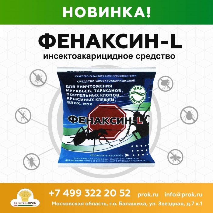 Новое инсектоакарицидное средство Фенаксин L представляет собой дуст в виде порошка от белого до серого цвета, полностью готовый к применению. Два активных действующих вещества обеспечивают острую инсектоакарицидную активность препарата против насекомых и последующий защитный эффект в течение 6 недель, подходит для уничтожения бытовых насекомых: