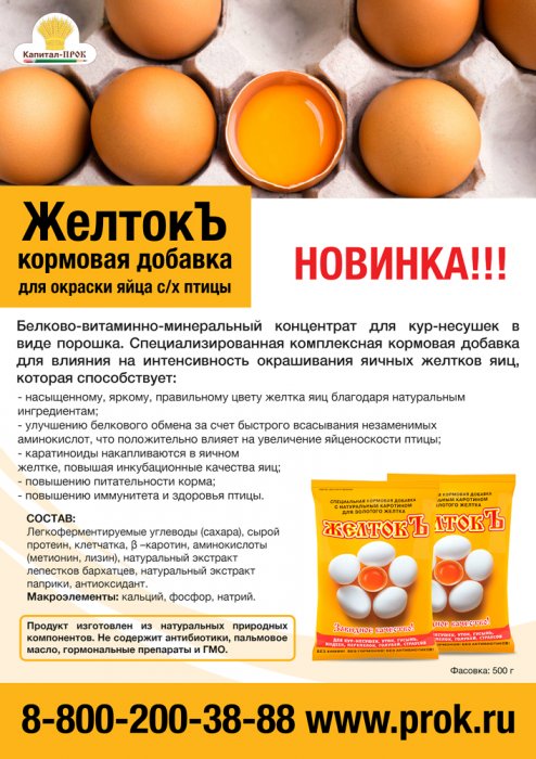Белково-витаминно-минеральный концентрат для кур-несушек Желток в виде порошка. Специализированная комплексная кормовая добавка для влияния на интенсивность окрашивания яичных желтков яиц, которая способствует: