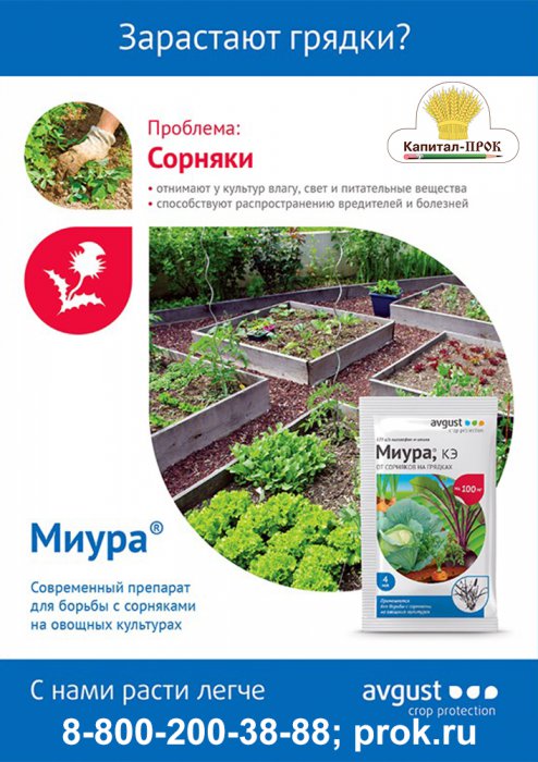 Миура — гербицид от сорняков на грядках для личных подсобных хозяйств. Действие препарата на сорняки проявляется в виде пожелтения и побурения через 7-10 дней с момента обработки. Полная их гибель наступает через 2-3 недели после обработки в зависимости от вида сорняков и погодных условий.