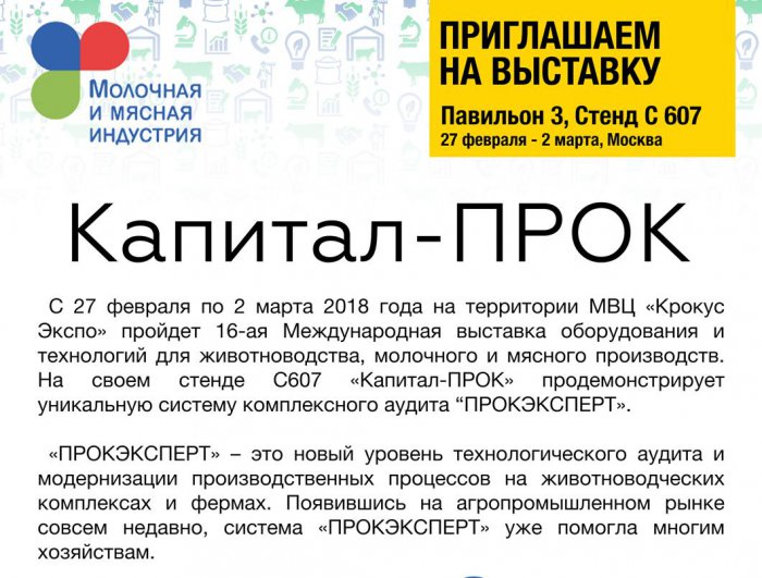 Выставка «Молочная и мясная индустрия» проходит ежегодно на протяжении 16-ти лет. Это одно из крупнейших бизнес-мероприятий, собирающих передовых специалистов молочной и мясной отраслей животноводства. Выставка проходит при поддержке Министерства сельского хозяйства России, и является одной из самых крупных в России согласно Общероссийскому рейтингу выставок. С каждым годом выставка растет и развивается, но неизменно в ней принимают активное участие такие агропромышленные компании, как «Капитал-ПРОК». Этот год не станет исключением.