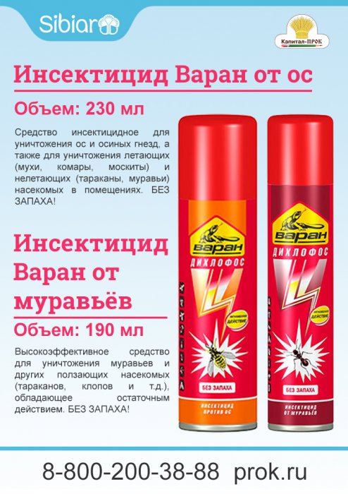 Дихлофос Варан от ос – для уничтожения ос и осиных гнезд, а также для уничтожения летающих (мухи, комары, москиты, бабочки моли) и нелетающих (тараканы, клопы, блохи, муравьи, кожееды) насекомых в помещениях.