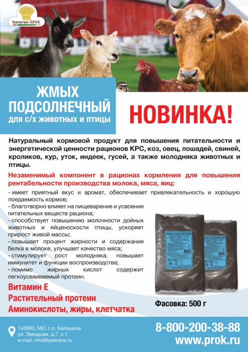 Жмых подсолнечный представляет собой сыпучий продукт, со свойственным подсолнечному жмыху запахом, предназначен для повышения питательности и энергетической ценности рационов КРС, коз, овец, лошадей, свиней, кроликов, кур, уток, индеек, гусей, а также молодняка животных и птицы.