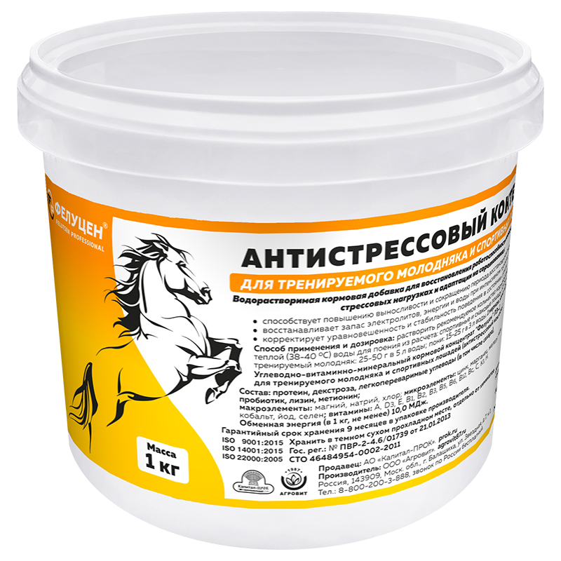 Коктейль Фелуцен для лошадей антистрессовый - высококачественная водорастворимая кормовая добавка, со специально подобранным комплексом биологически активных веществ и минералов, обеспечивающая высокую работоспособность лошадей. Коктейль обеспечивает быстрое поступление в организм лошади питательных веществ, жизненно важных для поддержания здоровья, стабилизирует работоспособность при высоких нервных и физических стрессовых нагрузках.Способствует: