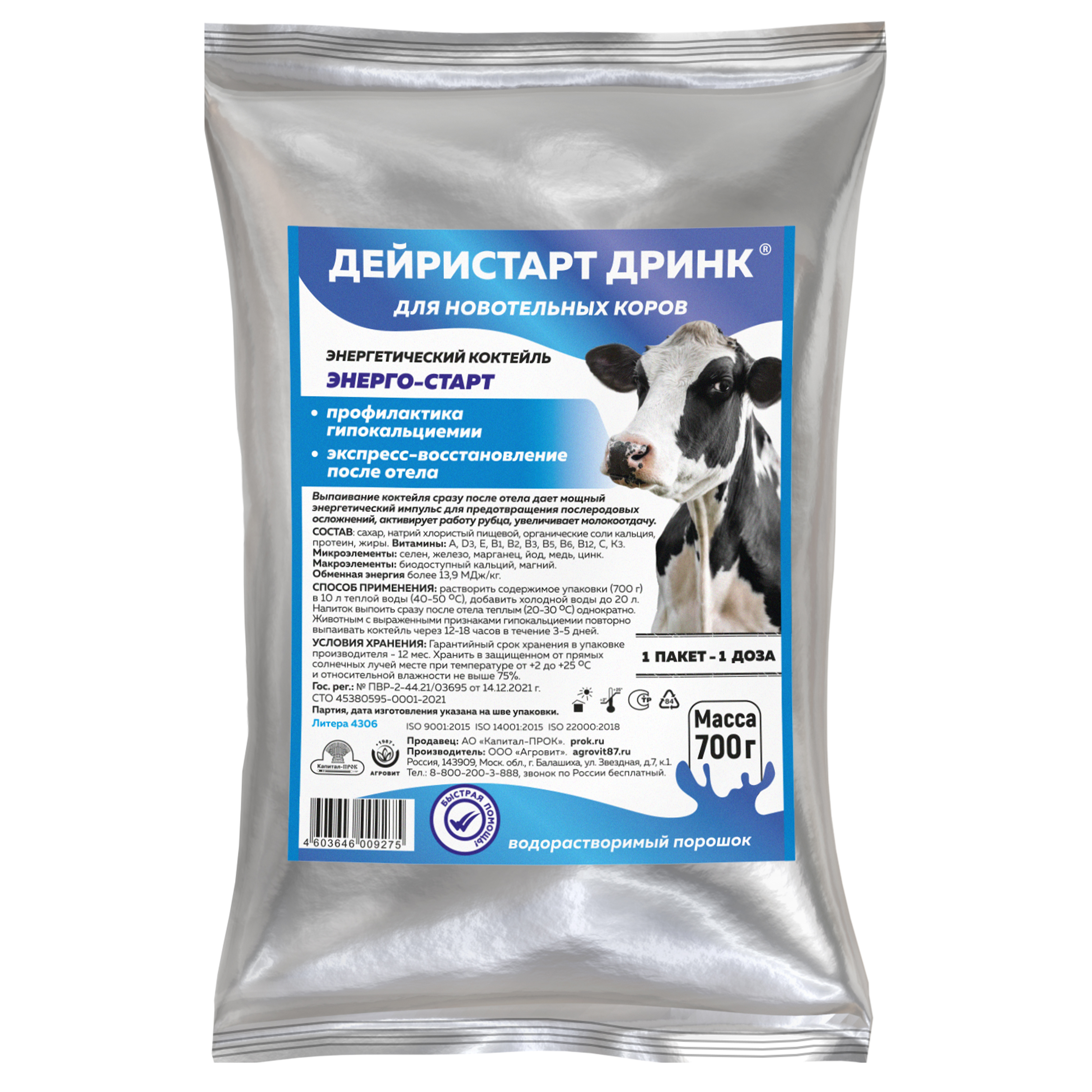 Энергетический кормовой комплекс Дейристарт Дринк Энерго-Старт - это многоцелевая водорастворимая добавка в виде порошка для быстрой профилактики гипокальциемии и симптоматического лечения послеродовых осложнений (кетоз, послеродовой парез, эклампсия, задержание последа), содержащая биологически активные вещества, необходимые для восстановления организма коров после отела. Способствует: