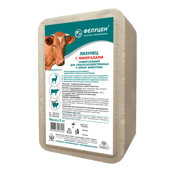 Фелуцен — лизунец унмверсальный (с МЭЛ) удобен в применении как на семейных фермах,так и на промышленных комплексах. Небольшая суточная потребность и невысокая стоимость лизунца удовлетворит спрос любого специалиста по кормлению. Применяя мультиминеральный комплекс «Фелуцен» зооветспециалисты хозяйства будут уверены в гарантии обеспечения всего поголовья животных сбалансированным продуктом первой необходимости в применяемых рационах.