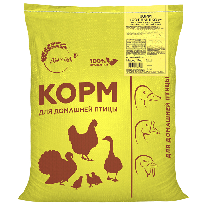 Корм Солнышко предназначен для молодняка домашней птицы (цыплятам, перепелятам, цесарятам, индюшатам, гусятам и утятам) от 0 до 4-х недель и максимально отвечает требованиям организма птицы. Корм состоит из натуральных компонентов – экологически чистых продуктов высокого качества, оптимально сбалансированных по всем ингредиентам, что позволяет обеспечить молодняк птиц всеми веществами в первые дни жизни. Важным фактором роста молодняка является содержание в корме витаминов, макро- микроэлементов, аминокислот.