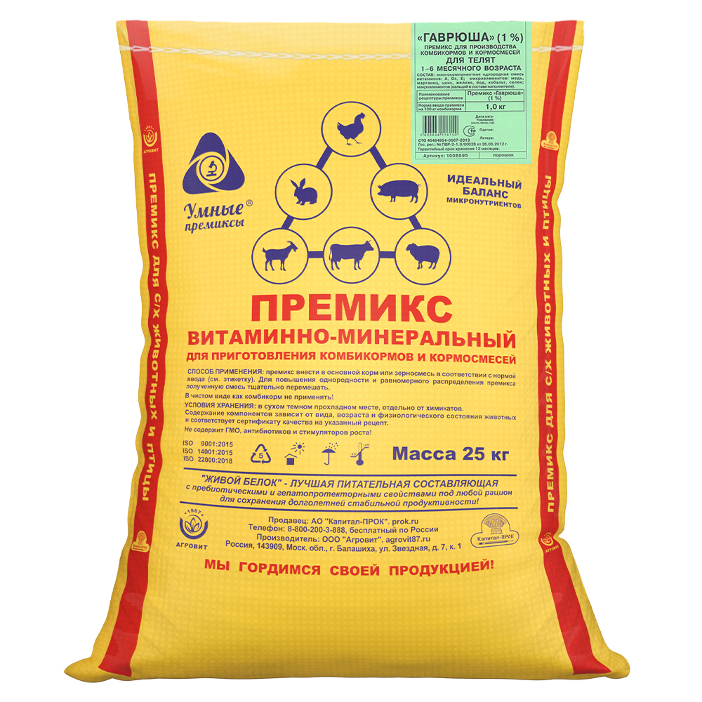 Премикс Гаврюша - кормовая добавка предназначенная для производства комбикормов и кормосмесей для телят 1-6 месячного возраста. Скармливание премикса Гаврюша телятам 1-6 месячного возраста способствует предупреждению заболеваний, вызванных дефицитом минеральных веществ и витаминов, повышению устойчивости организма к болезням, способствует повышению продуктивности, сохранности животных и эффективности использования корма, улучшению пищевой и технологической ценности мяса. Способствует: