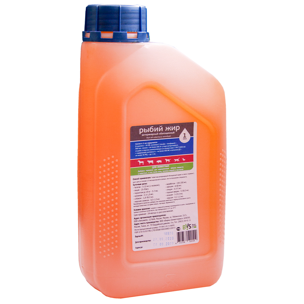 Рыбий жир ветеринарный обогащенный - это витаминизированный рыбий жир, способствующий повышению питательной ценности кормов, нормализации обмена веществ и увеличению продуктивности животных и птицы, улучшает рост и развитие молодняка, улучшает функции иммунной системы, уменьшает риск развития заболеваний суставов, участвует в регуляции обмена кальция в организме и формировании костной ткани.