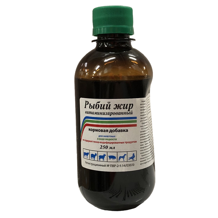 Рыбий жир витаминизированный – добавка кормовая для нормализации обмена веществ у животных, в том числе птиц. По внешнему виду представляет собой маслянистую жидкость, от светло-желтого до светло-коричневого цвета.