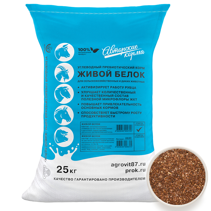 Углеводно - пребиотический корм Живой белок для обогащения рациона животных легкопереваримыми углеводами и растительными волокнами, минералами и витаминами.