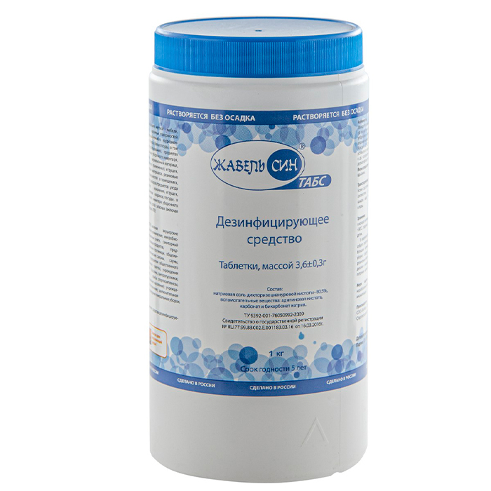 В качестве действующего вещества в состав средства входит натриевая соль дихлоризоциануровой кислоты–80,5%, а также вспомогательные вещества (адипиновая кислота, натрий карбонат и натрий бикарбонат). Массовая доля активного хлора г, таблетки 1,70±0,17.