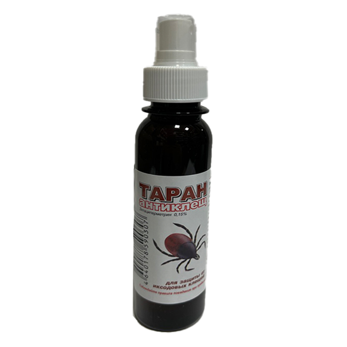 Инсектоакарицидное средство Таран антиклещ - это готовая к применению водная эмульсия в виде жидкости матового цвета. Содержит в качестве действующего вещества (ДВ) высокоактивное соединение из группы пиретроидов - Зетациперметрин в количестве 0,15%. Упаковывается во флаконы 100мл с микроспреем.