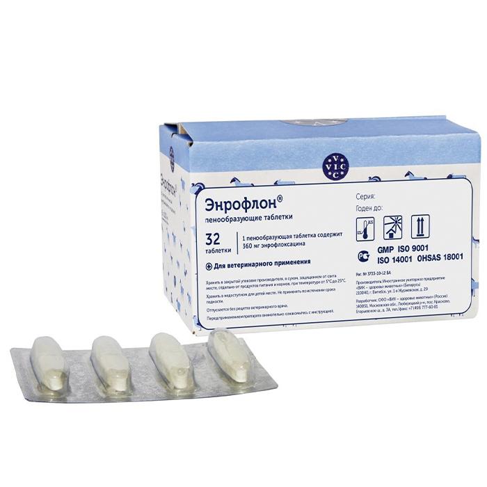 Антибактериальный препарат, содержащий в качестве действующего вещества энрофлоксацин (0,36 г в каждой таблетке).