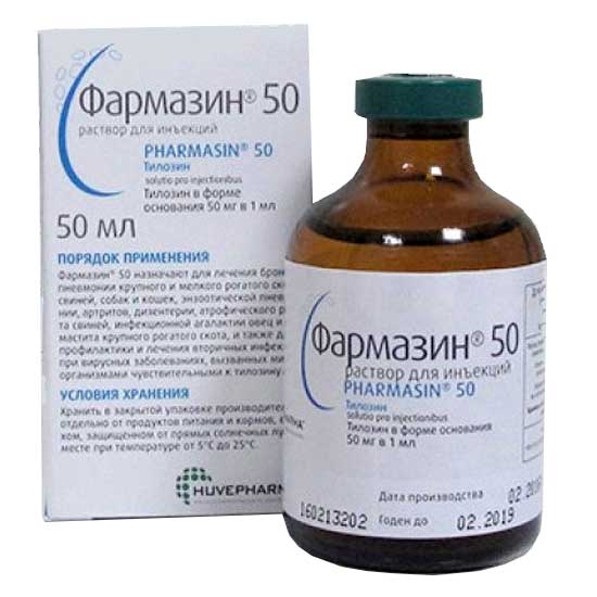 Лекарственный препарат содержит в качестве активнодействующего вещества антибиотик тилозин в форме основания в органическом растворителе. Фармазин 50 содержит 50 мг тилозина в 1 мл.
