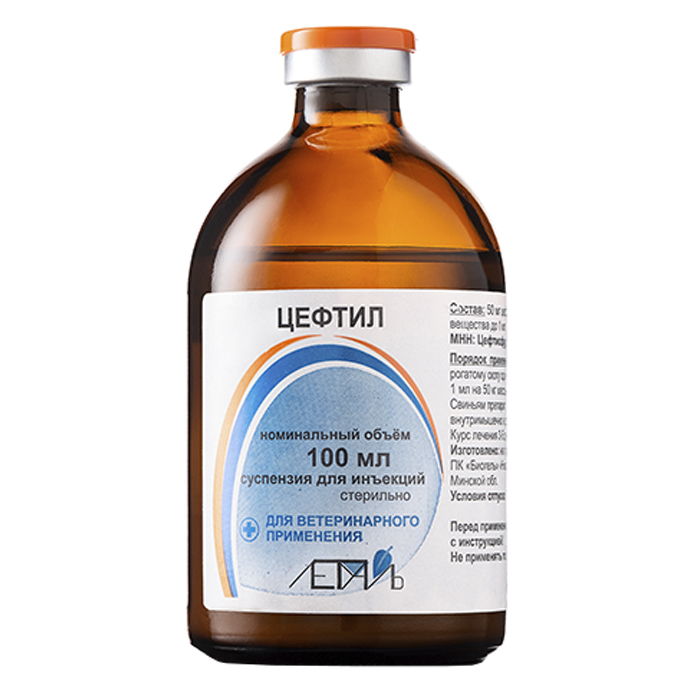 Цефтил (Ceftilum) - препарат для лечения крупного рогатого скота и свиней при бактериальных инфекциях органов дыхания и желудочно-кишечного тракта. По внешнему виду представляет собой суспензию от белого до кремового цвета. Допускается расслоение при хранении.
