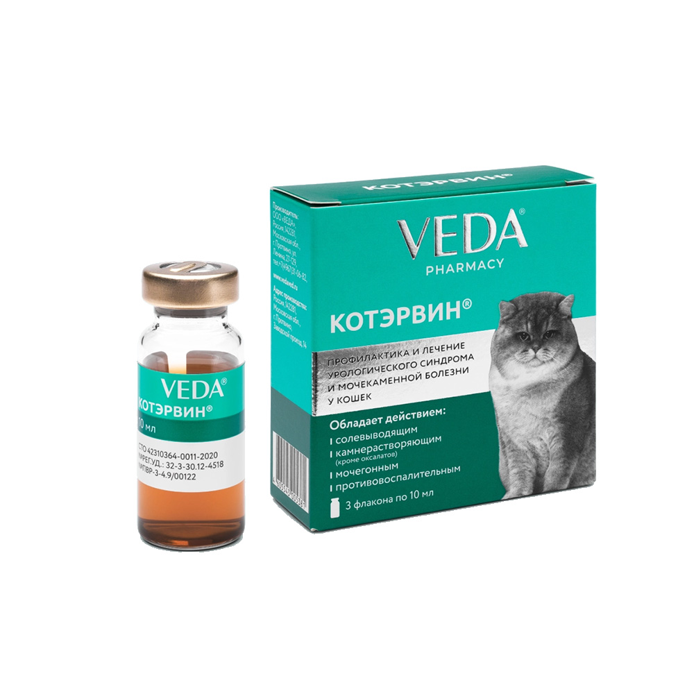 Котэрвин® назначают для профилактики и лечения урологического синдрома и мочекаменной болезни у кошек.