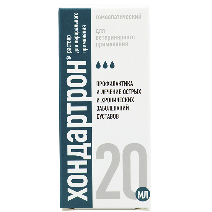 Хондартрон раствор для перорального применения (Chondartron oral solution) назначают собакам и кошкам для профилактики и в комплексной терапии острых и хронических заболеваний суставов и околосуставных структур (синовит, артрит), заболеваний и травм сухожильносвязочного аппарата (тендовагинит), а также в реабилитационный период после переломов и хирургических вмешательств на опорно-двигательном аппарате. По внешнему виду препарат представляет собой бесцветную прозрачную жидкость.
