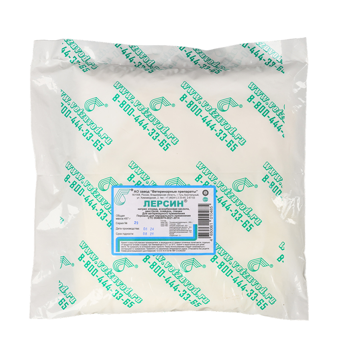 Лерсин - комбинированный препарат в форме порошка и мелких гранул для профилактики и ранней терапии острых желудочно-кишечных заболеваний неинфекционной этиологии новорожденным телятам. По внешнему виду содержимое пакета № 1 (поливинилпирролидон) представляет собой порошок белого или слегка желтоватого цвета; содержимое пакета № 2 (глюкоза) — порошок или мелкие гранулы белого или слегка желтоватого цвета; содержимое пакета № 3 (натрий и калий хлористый, аскорбиновая и аминоуксусная кислоты, кальций молочнокислый и кальций уксуснокислый) — порошок от белого до светло-желтого цвета.