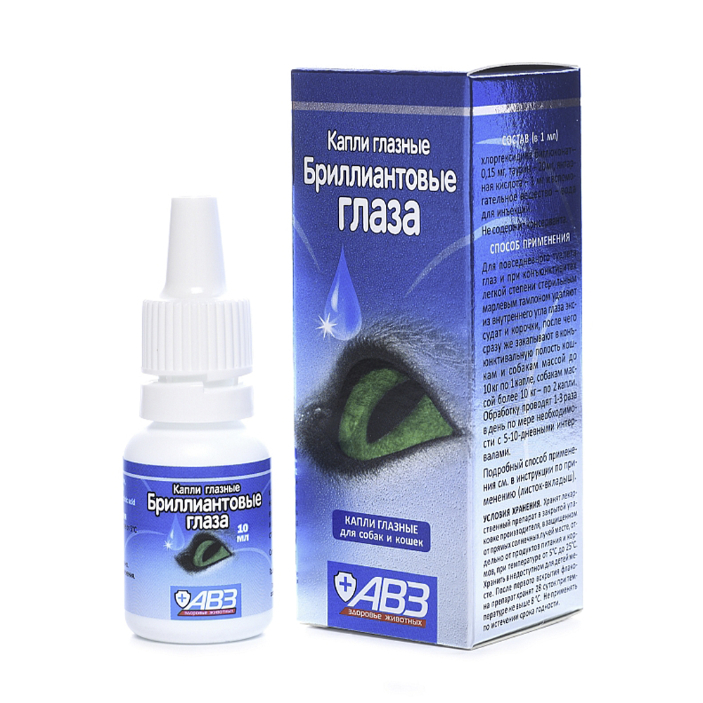 Бриллиантовые глаза - капли глазные для лечения и профилактики офтальмологических заболеваний у собак и кошек. По внешнему виду лекарственный препарат представляет собой прозрачную жидкость.