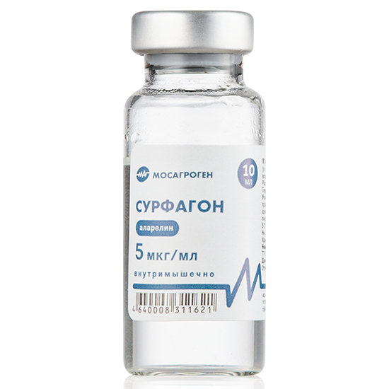 Сурфагон - синтетический нанапептид, аналог гонадотропин-рилизинг гормона ЛГ-РГ-люлиберина для лечения гипофункции яичников и фолликулярных кист, для увеличения функциональной активности желтого тела яичников, повышения оплодотворяемости самок, ранней индукции полового цикла.. Выпускают в виде стерильного раствора в 0,9 % растворе хлорида натрия с консервантом нипагином.
