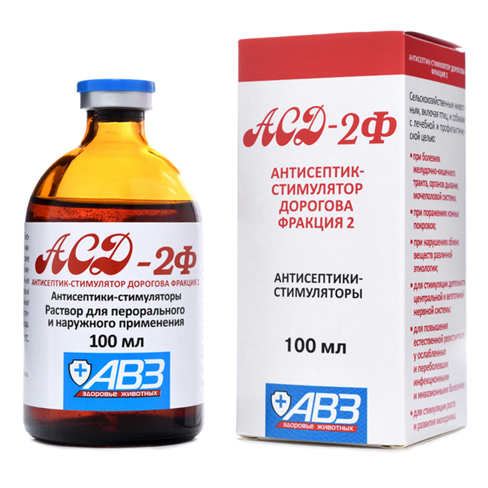 Внутрь АСД-2Ф назначают животным с питьевой водой перед кормлением. Наружно АСД-2Ф применяют в виде 15–20% растворов, приготовленных на стерильном физиологическом растворе или кипяченой воде. При приготовлении лечебного раствора требуемой концентрации исходный стерильный раствор АСД-2Ф принимают за 100%.