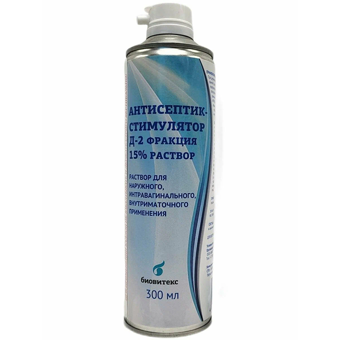 Антисептик -Стимулятор Д-2 фракция выпускают расфасованным по 300 мл в алюминиевые баллоны с инертным газом под давлением (изобутан и азот до 5,8 бар) с насадкой для распыления. Каждая единица фасовки снабжается инструкцией по применению.