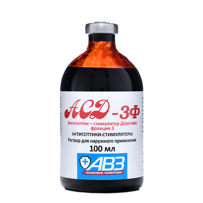 АСД-3Ф – антисептик стимулятор Дорогова фракция 3 для лечения дерматитов, инфицированных ран, трофических язв и других поражений кожи и копыт у животных .