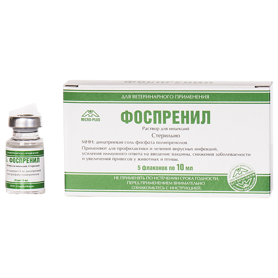 Фоспренил (Phosprenyl) - раствор для инъекций для стимуляции неспецифической резистентности и лечения вирусных инфекций у животных и птиц. По внешнему виду препарат представляет собой прозрачный или слабо опалесцирующий раствор, бесцветный или с желтоватым оттенком.