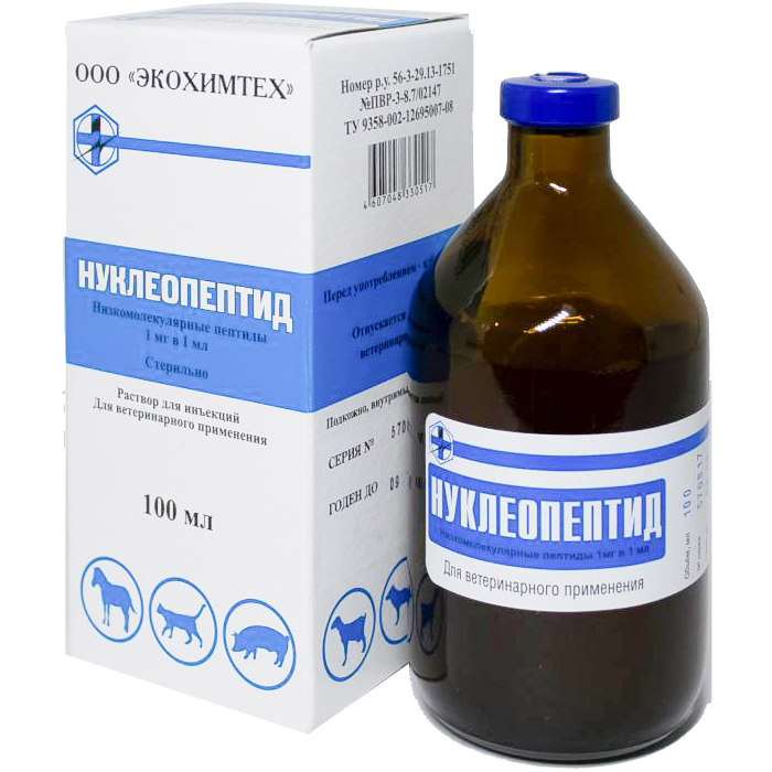 Нуклеопептид - препарат для увеличения привесов при откорме и повышения резистентности молодняка КРС и свиней, а также для ускорения роста и улучшения качества шерсти кошек и собак.