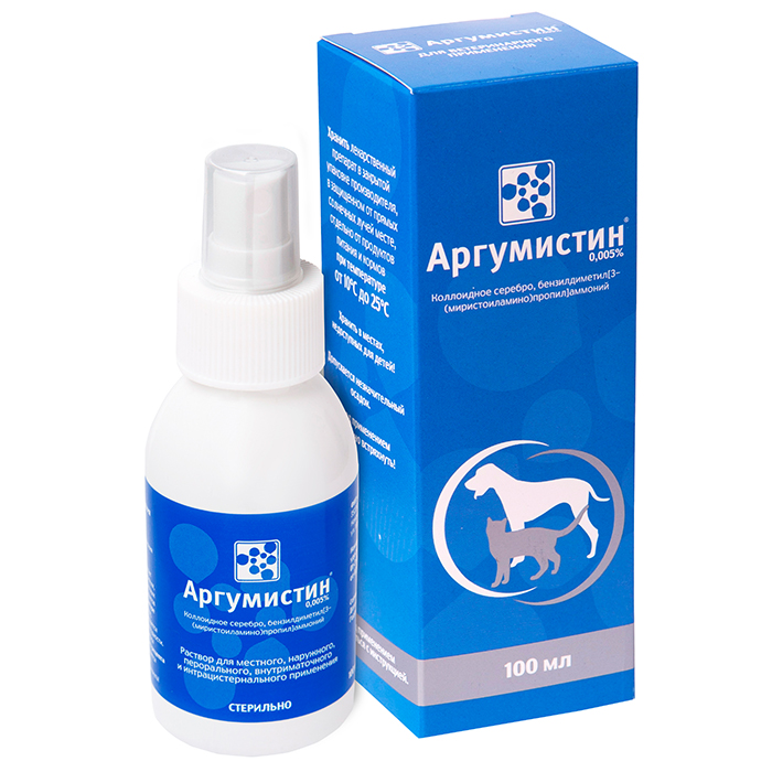 Аргумистин (Argнmistin) спрей - применяют в комплексной терапии для лечения гингивитов, стоматитов, конъюнктивитов, отитов, ринитов, дерматомикозов, циститов, уретритов, эндометритов, ожогов, обработки ран (в т. ч. открытых и послеоперационных), при желудочно-кишечных заболеваниях у собак и кошек, а также для обработки ран и при лечении маститов, эндометритов у крупного рогатого скота. По внешнему виду препарат представляет собой опалесцирующую жидкость светло-коричневого цвета.