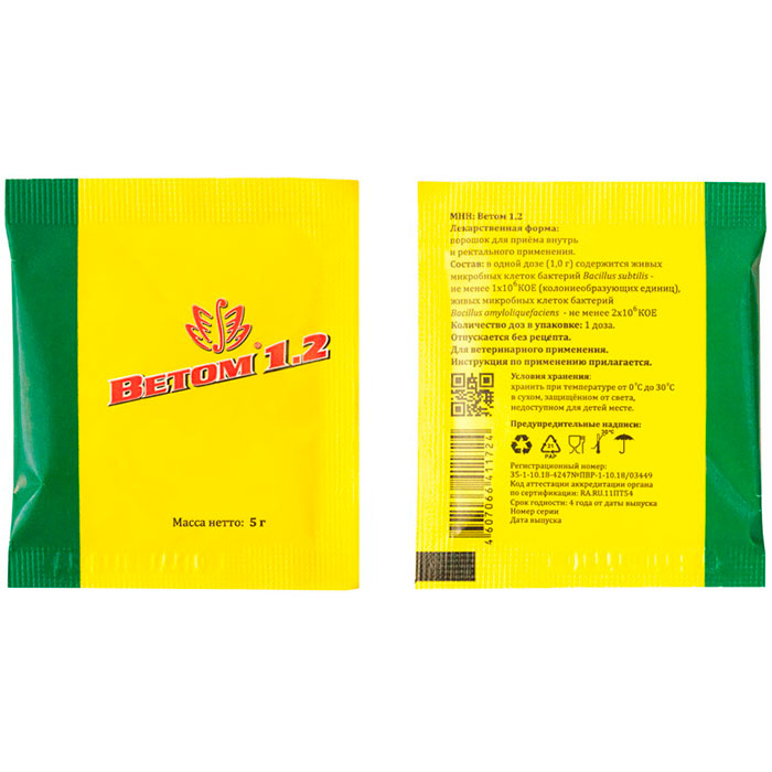 Ветом 1.2 содержит сухую бакмассу живых спорообразующих бактерии штамма Bacillus subtilis ВКПМ В-10641, Bacillus amyloliquefaciens ВКПМ В-10642 и Bacillus amyloliquefaciens ВКПМ В-10643, а также вспомогательные вещества - сахарную пудру и крахмал. В 1 г препарата содержится: живых микробных клеток бактерий Bacillus subtilis - не менее lx106 КОЕ (колониеобразующих единиц), живых микробных клеток бактерий Bacillus amyloliquefaciens - не менее 2х106 КОЕ.