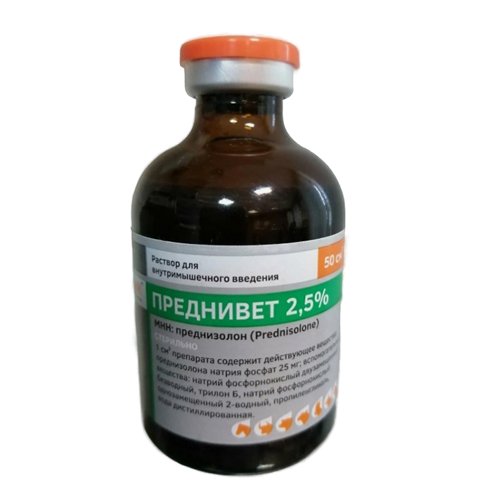 Преднивет 2,5% (Prednivetum 2,5%) - препарат для экстренной терапии при аллергических и шоковых состояниях, острых инфекционных заболеваниях (в комбинации со средствами этиотропной терапии). Препарат представляет собой прозрачную бесцветную или слегка желтоватую жидкость.