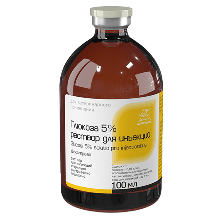 Глюкоза 5% - раствор для инъекций применяют животным при больших потерях организмом жидкости (кровотечения, токсическая диспепсия). По внешнему виду препарат представляет собой бесцветную или слегка желтоватую прозрачную жидкость.