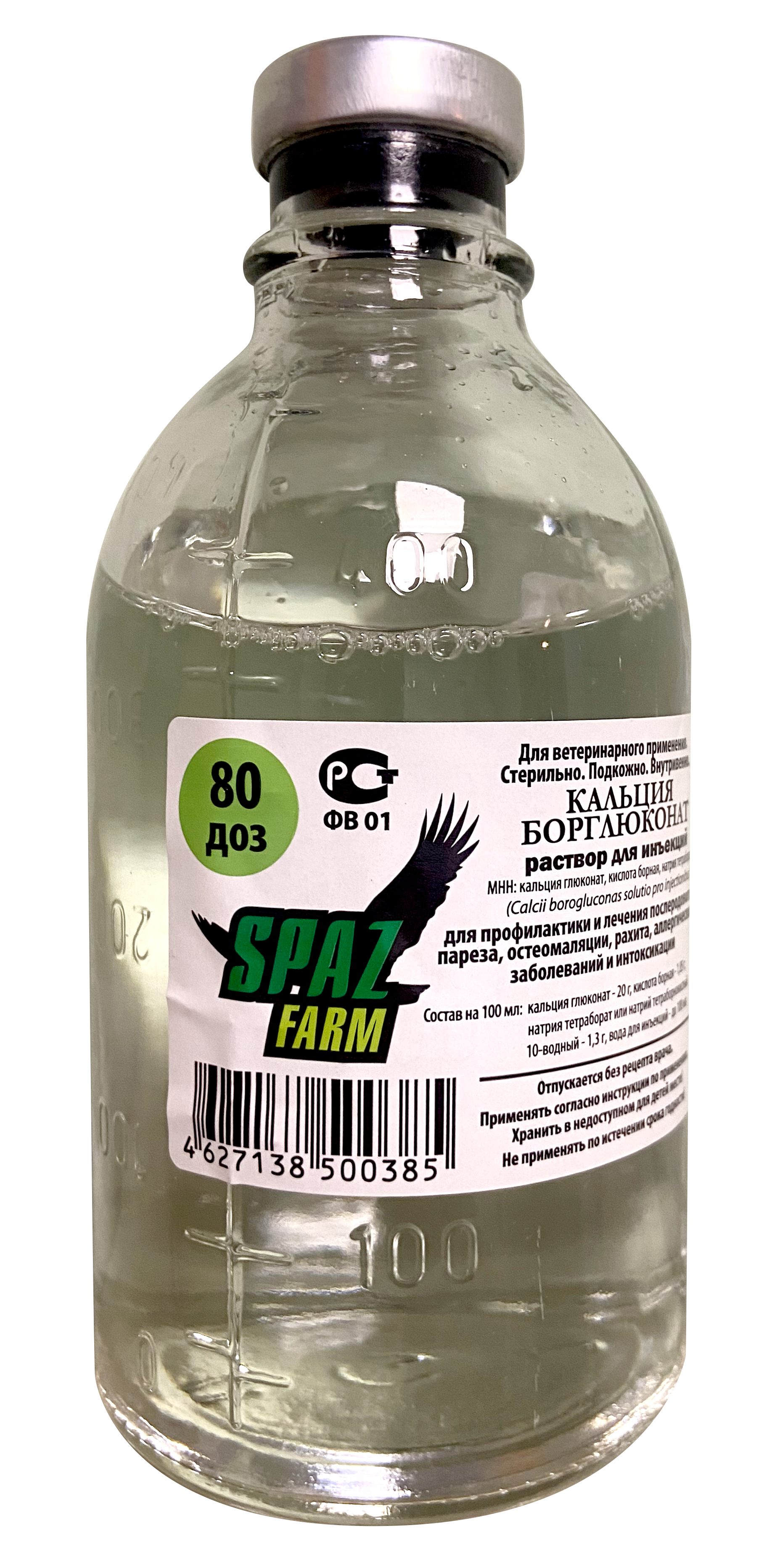 Кальция борглюконат, подогретый до температуры 35-37°С, вводят животным внутривенно (медленно) или подкожно из расчета 0,5 мл/кг массы животного.