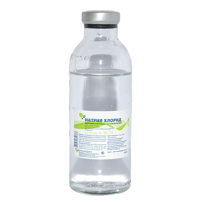Натрия хлорид изотонический 0,9% - раствор для инъекций при обезвоживании и интоксикации организма животных. По внешнему виду Натрия хлорид изотопический 0,9% раствор для инъекций представляет собой бесцветную прозрачную жидкость.