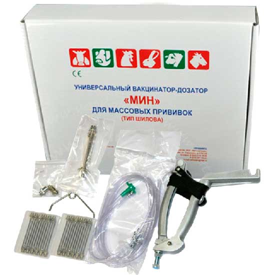 Универсальный вакцинатор-дозатор МИН для массовых прививок - представляет собой приспособление для фиксации 5-ти миллилитрового шприца в рабочем положении с целью введений с/х животным и птицам жидких лекарственных препаратов.
