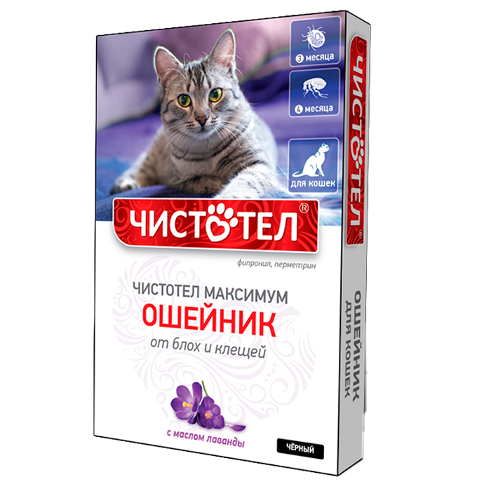 Постоянное ношение Чистотел Максимум ошейника обеспечивает защиту кошек от иксодовых клещей на протяжении 3 месяцев, от насекомых - на протяжении 4 месяцев.