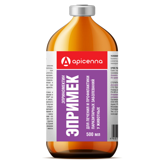 Эпримек (Eprimec) - раствор для инъекций при паразитарных болезнях КРС, оленей, верблюдов, свиней, МРС, кошек и собак. По внешнему виду препарат представляет прозрачный раствор желтоватого цвета.