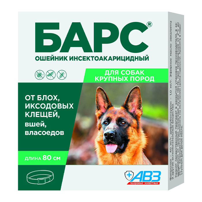 Ошейник инсектоакарицидный Барс – применяют собакам с лечебной и профилактической целью при энтомозах (блохи, вши, власоеды) и поражении иксодовыми клещами.