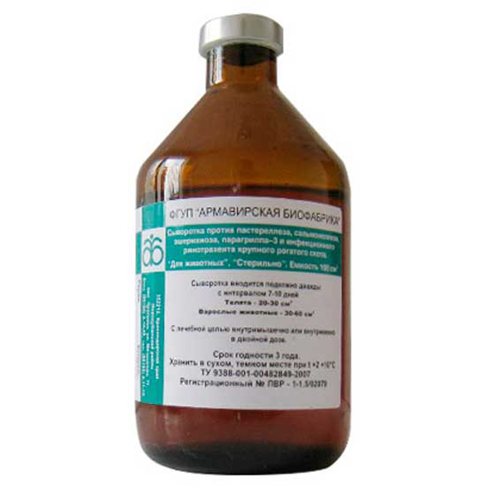 Сыворотка пр. пастерел.,сальмонел.,эшерихиоза, парагриппа-3 и инф. ринотрахеита КРС (100мл-2 д)