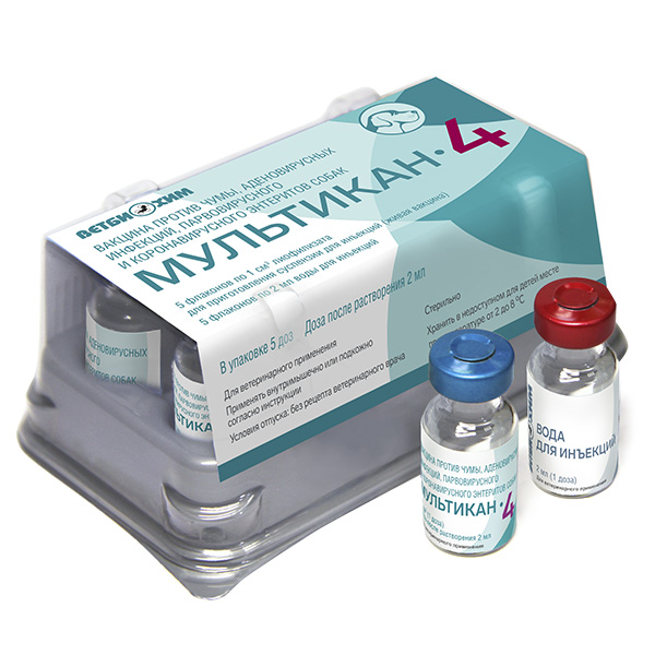 Мультикан-4 - вакцина против чумы, аденовирусных инфекций, парвовирусного и коронавирусного энтеритов собак. По внешнему виду лиофилизированный компонент представляет собой сухую однородную мелкопористую массу желто-розового цвета. Жидкий компонент - бесцветная прозрачная жидкость.