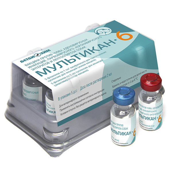 Мультикан-6 – вакцина против чумы, аденовирусных инфекций, парвовирусного, коронавирусного энтеритов и лептоспироза собак. По внешнему виду лиофилизированный компонент представляет собой сухую однородную мелкопористую массу желто-розового цвета. Жидкий компонент - прозрачную или слегка опалесцирующую жидкость, цвет которой может варьировать от бесцветного до слегка желтоватого с серо-белым осадком на дне флакона разной интенсивности, разбивающимся при взбалтывании в гомогенную суспензию.