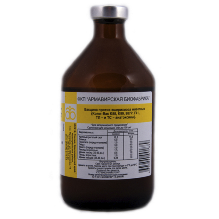 Вакцина предназначена для профилактики эшерихиоза сельскохозяйственных животных и пушных зверей клеточного содержания в хозяйствах, неблагополучных по данной болезни.