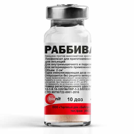 Инактивированной вакцины Раббивак-V против вирусной геморрагической болезни кроликов. Представляет собой светло-коричневого цвета с розовым оттенком суспензию тканевого инактивированнного физическим способом вируса геморрагической болезни кроликов, сорбированного на гидроокиси алюминия. Вакцина при хранении образует рыхлый осадок, легко разбивающийся при встряхивании.