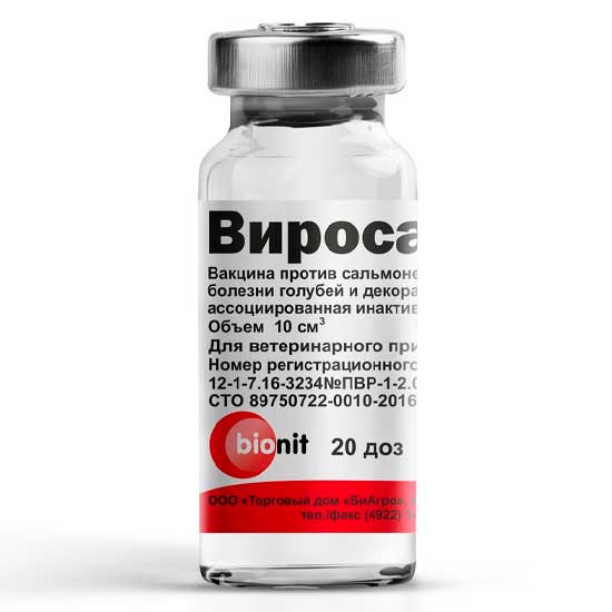 Виросальм - вакцина против сальмонеллеза и ньюкаслской болезни голубей и декоративных птиц ассоциированная инактивированная. Лекарственная форма – суспензия для инъекций. По внешнему виду вакцина представляет собой суспензию желтовато-серого цвета с рыхлым осадком, легко разбивающимся в гомогенную взвесь.