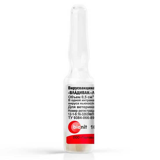 Владивак Ла-Сота - вирусвакцина против болезни Ньюкасла штамма. Препарат по внешнему виду представляет собой сухую пористую белую массу с однородной и мелкозернистой структурой, хорошо растворимую в воде без образования хлопьев и осадка.