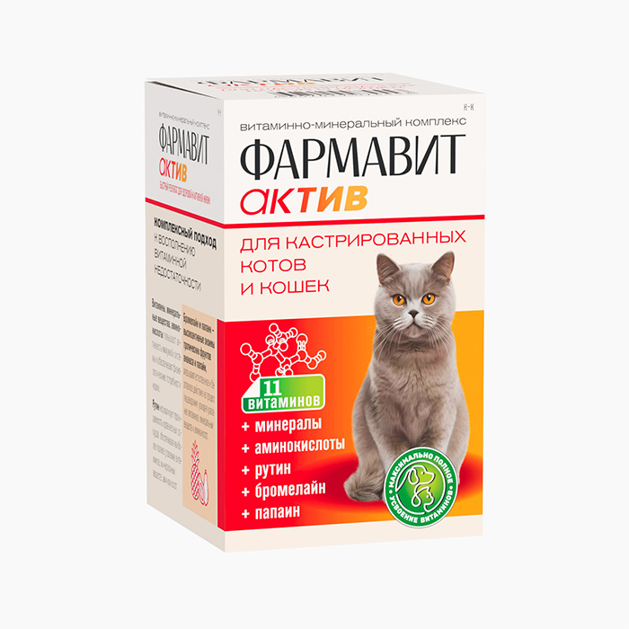 Фармавит Актив - витаминно-минеральный комплекс с фруктовыми энзимами, специально разработанный для кастрированных котов и кошек. Рекомендуется для нормализации обмена веществ и укрепления иммунитета, предупреждения ожирения, снижения риска возникновения мочекаменной болезни.
